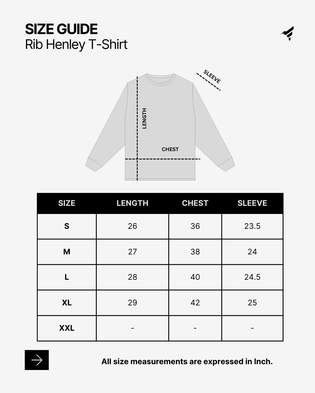 | Sleeve | 23.5 | 24 | 24.5 | 25 |